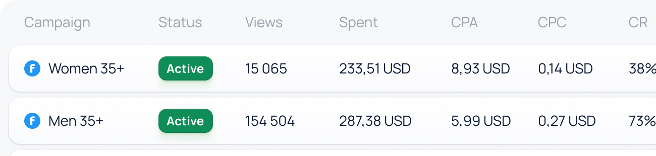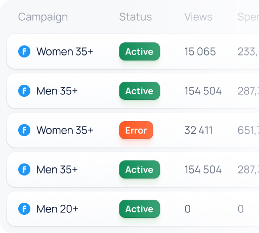 Manage campaigns, adsets, ads in one window: from launch to budget management and cost tracking